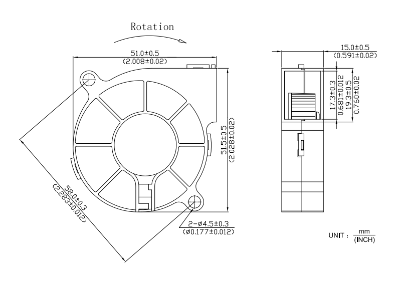尺寸:50x50x15MM 转速:3800--8000 RPM